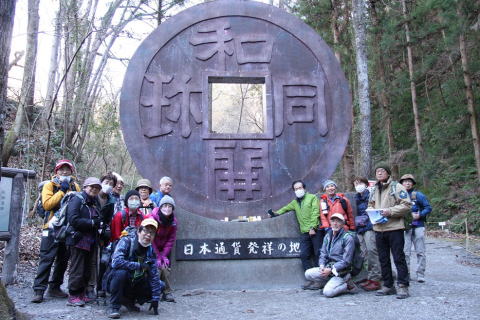 | 食事が終わり、一路和同遺跡に向かう。約5メートルも有る和同開珎のモニメントを見学及び記念 | |||||||