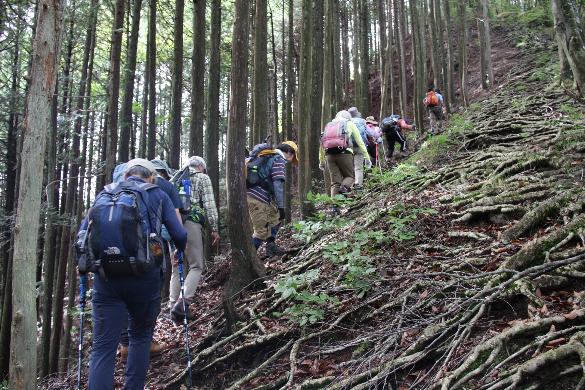| 急になり、木の根が張り出した急坂にさしかかる。息を切らせながら登るうち、背後に日光の街並み | ||||||