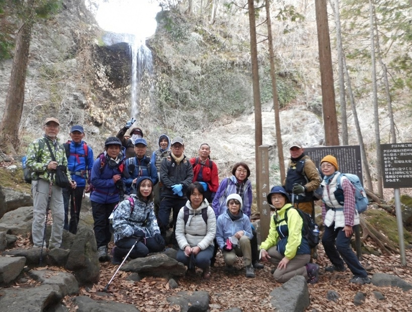 夕日の滝へ到着。雨の降らない日々が続いていたせいか水量が少なかった。下見の時は |